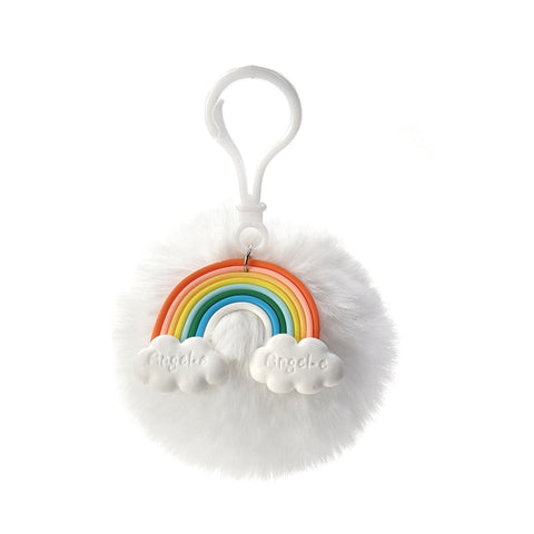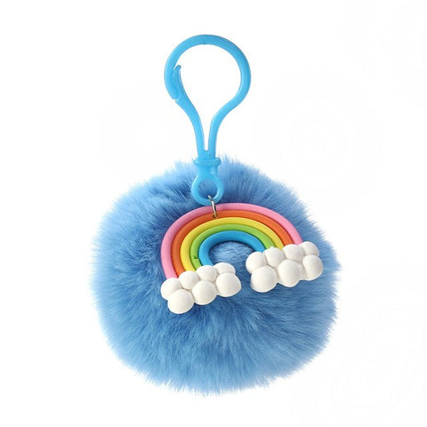 Doreen Box Plush Keychain & Keyring Pom Pom Ball White Blue Rainbow Plastic Lobster Clasp 11cm(4 3/8") x 8cm(3 1/8"), 1 Piece